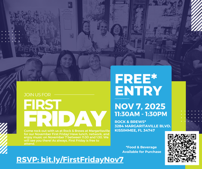 Come rock out with us at Rock & Brews at Margaritaville for our November First Friday! Have lunch, network, and enjoy music on November 7 between 11:30 and 1:30. We will see you there!