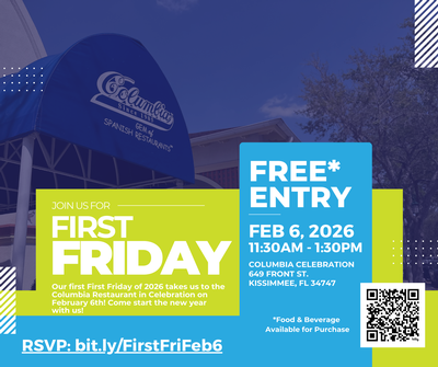 Our first First Friday of 2026 takes us to the Columbia Restaurant in Celebration on February 6th! Come start the new year with us!