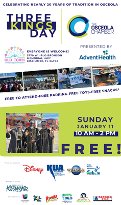 The Feast of the Three Kings is an intricate part of Latin Folklore. Traditionally, this day is very important, especially for children, for it is on this eve that they will receive their gifts. The celebration will include a visit from the Three Kings; FREE Hotdogs; FREE popcorn, cotton candy or snow cones; and a toy for children under 11. Bikes and tablets will be given away by raffle throughout the event.